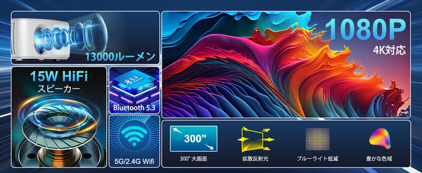 【令和6年3月新登場!コスパ最強】プロジェクター 超小型 13000LM高輝度 1080P 5GWiFi&Bluetooth5.3瞬時接続 4K対応 家庭用 300インチ大画面 超小型 フルHD高輝度 家庭用ホームプロジェクター 短距離投影 ホームシアター HiFiスピーカー/50%ズーム/台形補正/天井投影 省エネ 軽量 スマホ/パソコン/TVStick接続可 3年保証 お祝いのギフト